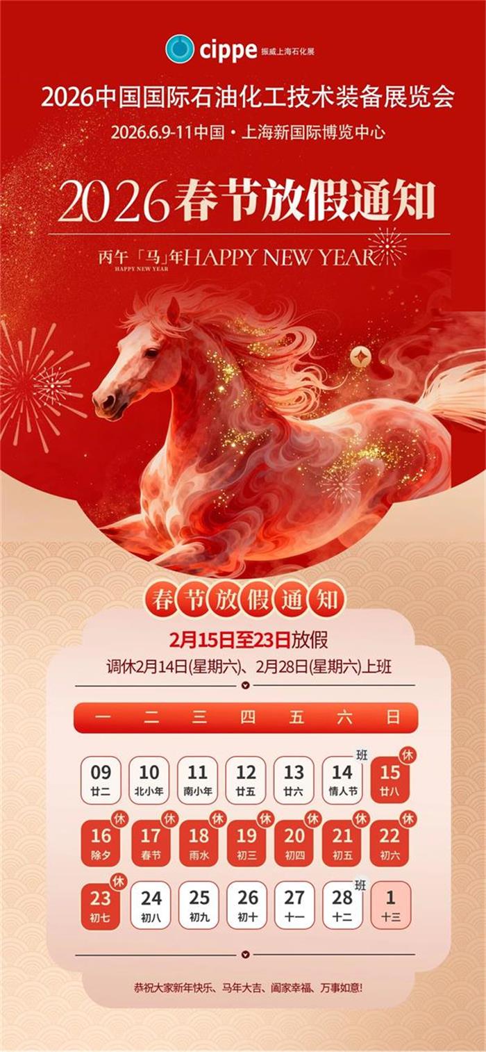 律回春晖渐,万象始更新。油气奔腾,金马扬蹄。值此新春佳节来临之际,cippe石油化工展组委会谨向全体展商致以最诚挚的新年祝福与最衷心的感谢!感恩 2025 的相遇与信任,期待2026的重逢与突破。cippe 将继续做全球石油石化装备行业的坚实桥梁。祝各位客户朋友:基业长青,马到功成!新春快乐!